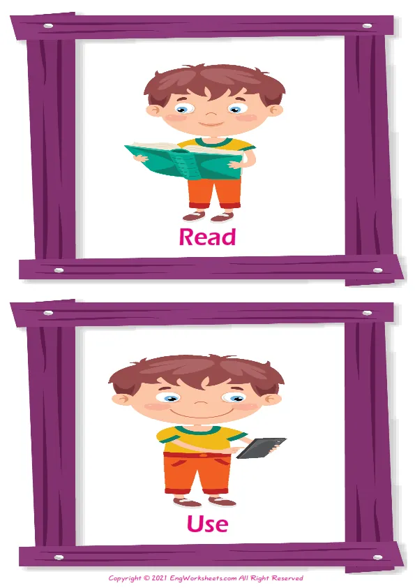 Action Verbs pictures flashcard supplied with words, with nine pictures on a page with a different design. You can print our worksheet prepared using Action Verbs pictures in different sizes and use it for remembering in your classroom or at home. Using thick paper, you can use it with your friends to carry it in your pocket or purse at all times or to play games in the classroom. Thus, learning will become much more fun.