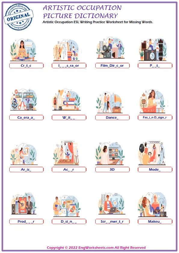 For a more challenging Artistic Occupation-related exercise, our Missing English Word Completion Worksheets or Word Matching Exercise Worksheet can help. These exercises require kids to fill in the blanks or match Artistic Occupation-related words, allowing them to test their knowledge in a more advanced way.