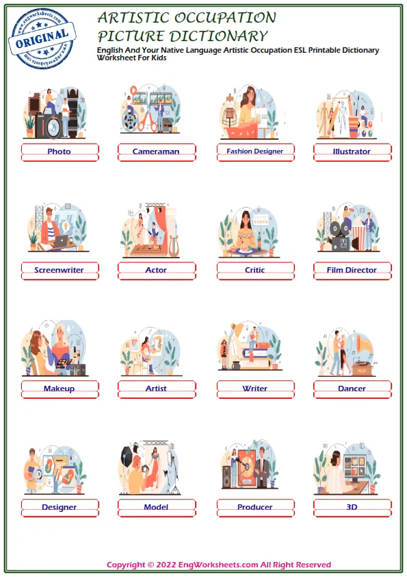 Artistic Occupation is a fascinating field, and it is important for kids to understand the vocabulary associated with it. At our site, we offer a range of free printable English ESL vocabulary worksheets that are perfect for improving your child's language skills related to Artistic Occupation.