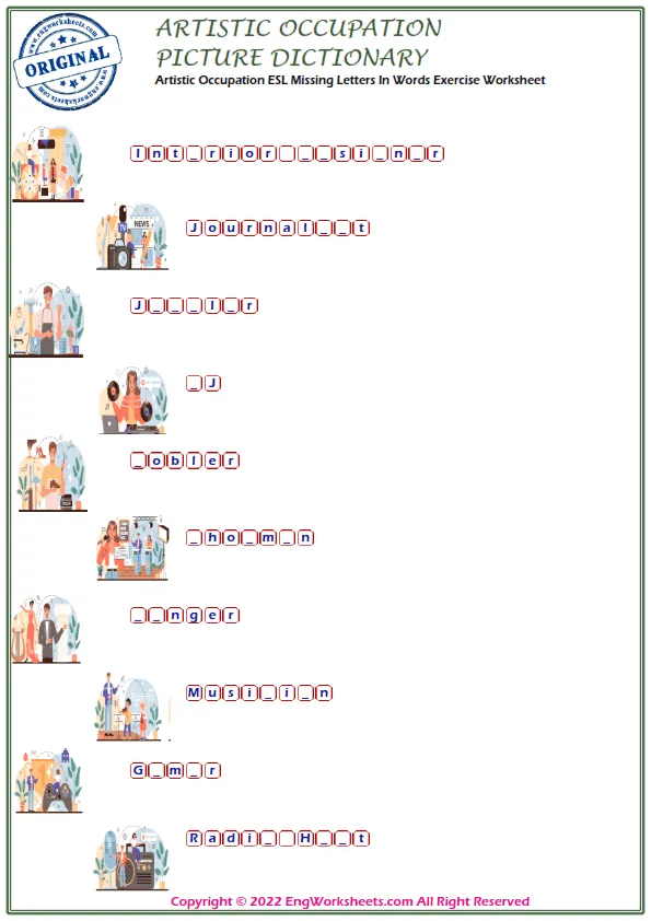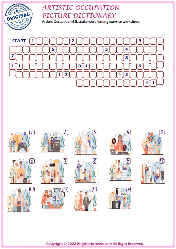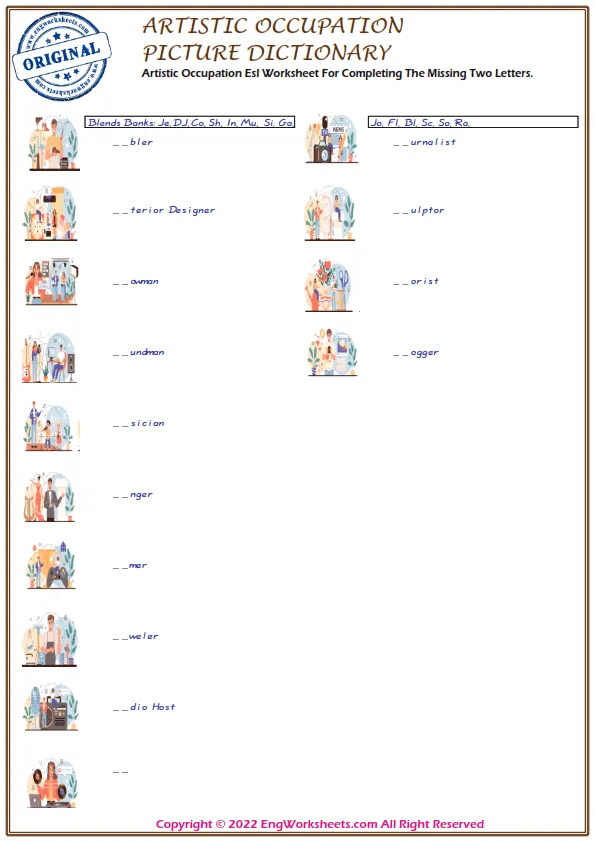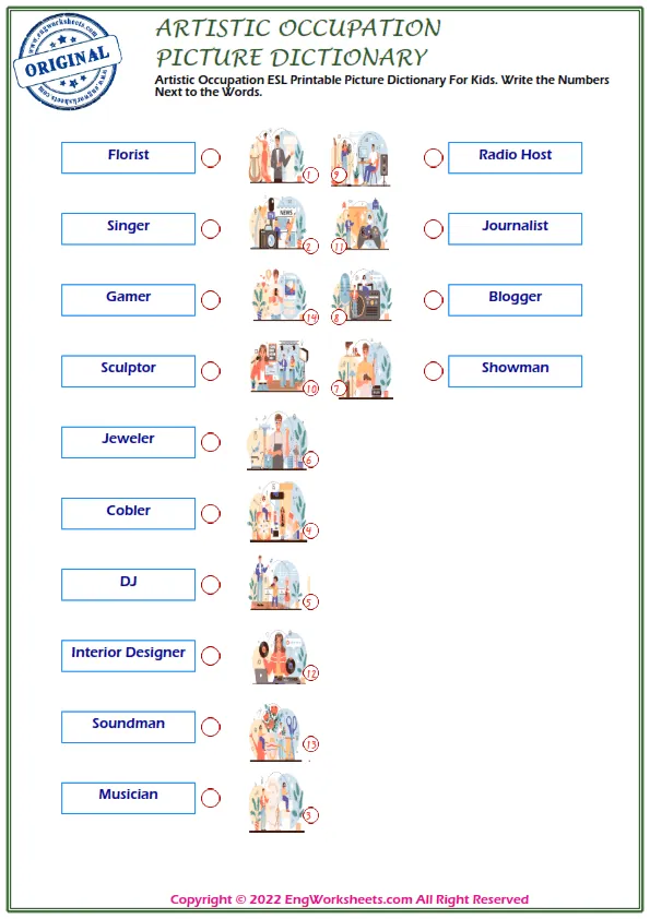 Artistic occupations are a fantastic way to promote creativity and self-expression. If you're an ESL teacher looking for engaging and fun ways to teach English vocabulary to your students, you'll want to check out these Artistic Occupation ESL printable English worksheets and exercises. These resources are perfect for kids and will make learning English more enjoyable.