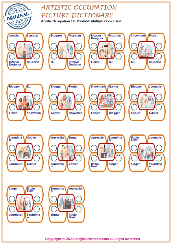 Finally, you can use the Multiple Choice English Tests to assess your students' understanding of the vocabulary related to artistic occupations. These tests are a great way to evaluate students' progress and ensure they're retaining what they've learned.