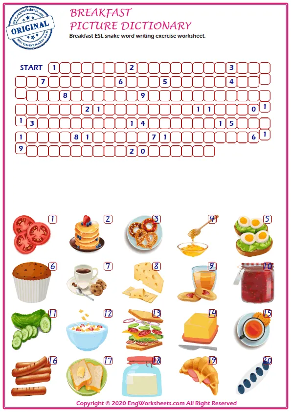 Word search and word snake puzzle worksheets are also excellent tools for reinforcing breakfast-related vocabulary. These puzzles challenge students to search for and identify words like omelette, muffin, and coffee, and help improve their spelling and vocabulary skills.