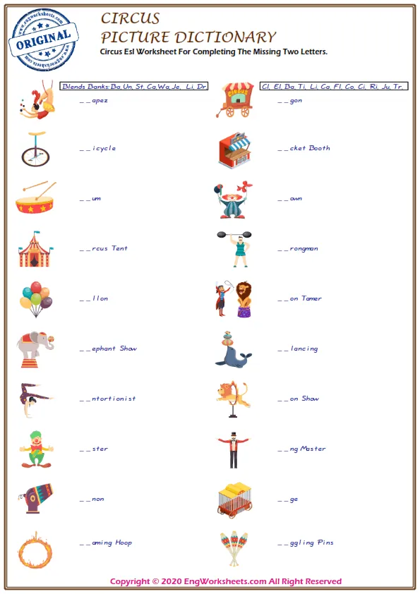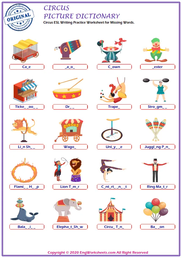 Missing English Word Completion Worksheets, Word Matching Exercise Worksheets, and Activities for Finding Mixed Words can also be helpful resources for teaching circus-related vocabulary. These worksheets are designed to help learners complete sentences, match words with their definitions, and find circus-related words in mixed-up words, respectively. They are highly effective tools for helping students build their vocabulary skills related to the circus.