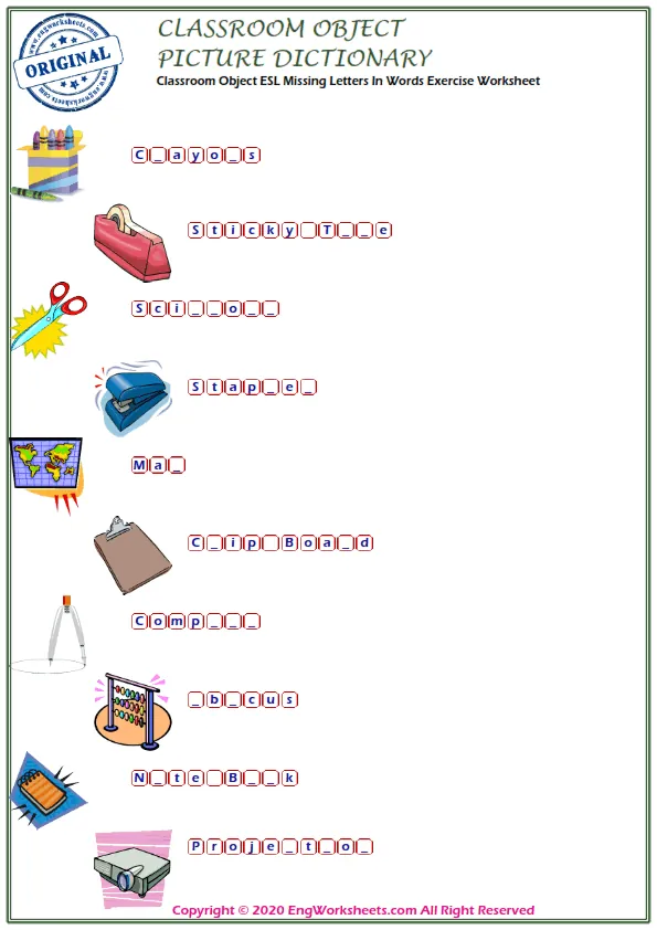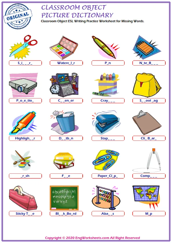 The Classroom Objects Free Printable English ESL Vocabulary Worksheets also feature exciting Activities for Finding Mixed Words, which make learning fun and interactive. These exercises are designed to help students improve their vocabulary skills and learn the names of different objects found in the classroom.