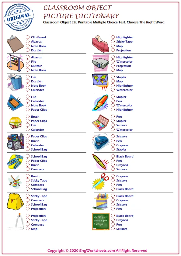 Furthermore, the ESL Vocabulary learning exercises and Multiple Choice English Tests in the pack provide additional opportunities for students to develop their English language skills. With a range of activities and exercises, this pack is a great resource for ESL learners looking to improve their vocabulary and language skills related to classroom objects.