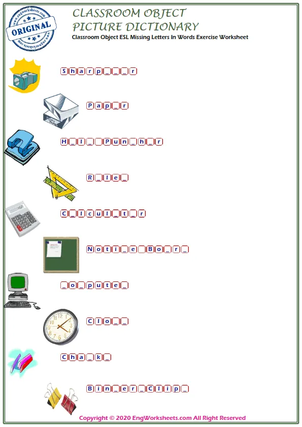 Utilize Missing English Word Completion Worksheets to assess students' understanding of Classroom Objects. These worksheets will help learners identify gaps in their vocabulary knowledge, as they work to complete sentences with the correct terms for Classroom Objects. This exercise will promote retention and mastery of essential English vocabulary.