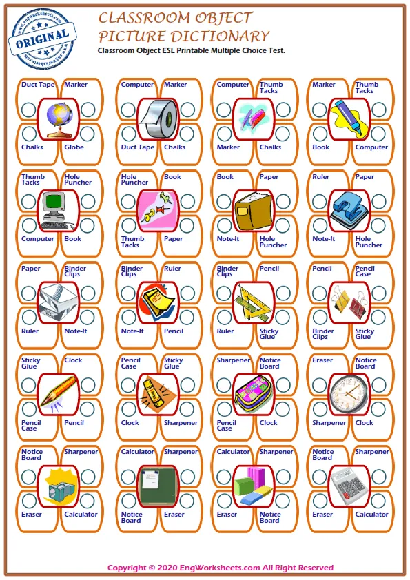 Finally, assess your students' progress with ESL Vocabulary learning exercises and Multiple Choice English Tests that feature Classroom Objects. These assessments will allow you to gauge students' understanding of classroom items and their corresponding English terms. By regularly evaluating students' proficiency, you can tailor your teaching to ensure mastery of Classroom Objects vocabulary.