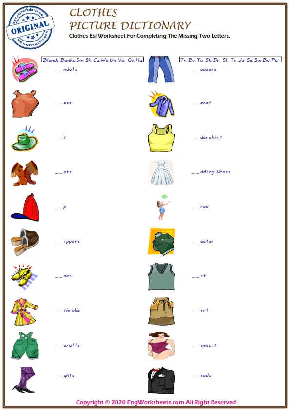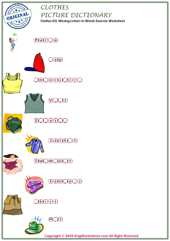 In conclusion, our Clothes-related ESL vocabulary worksheets offer a variety of resources for learners and teachers seeking to build language proficiency. With our fun and interactive exercises, learners can enhance their vocabulary and communication skills related to Clothes while having fun and improving their English language abilities.