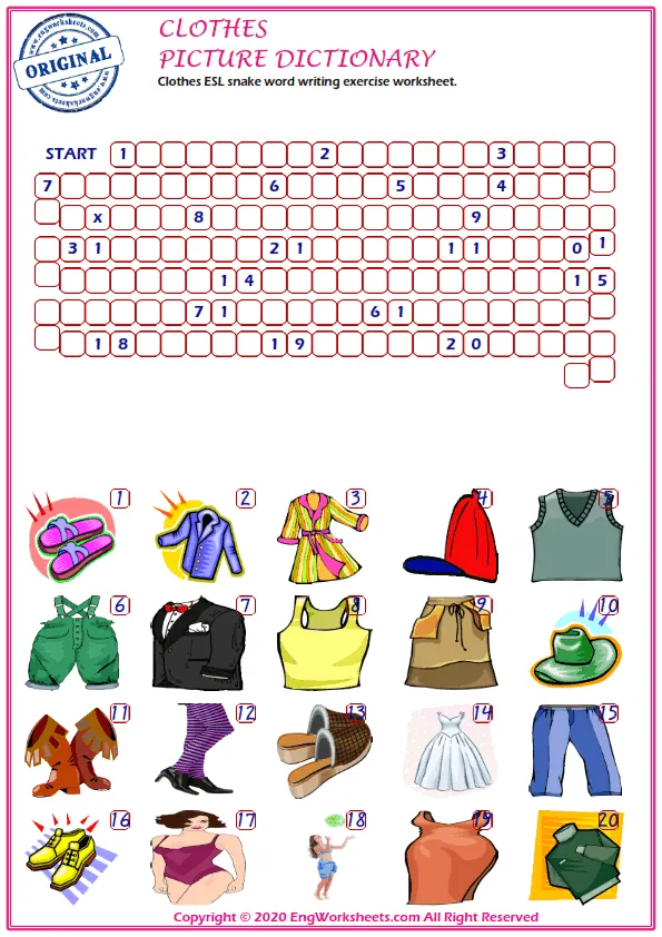 Our Word Search Puzzle Worksheet and Word Snake Puzzle Worksheet are interactive and challenging ways to build Clothes-related vocabulary skills. These worksheets challenge learners to search for Clothes-related words hidden in a grid or to solve a word puzzle by connecting letters to form words.