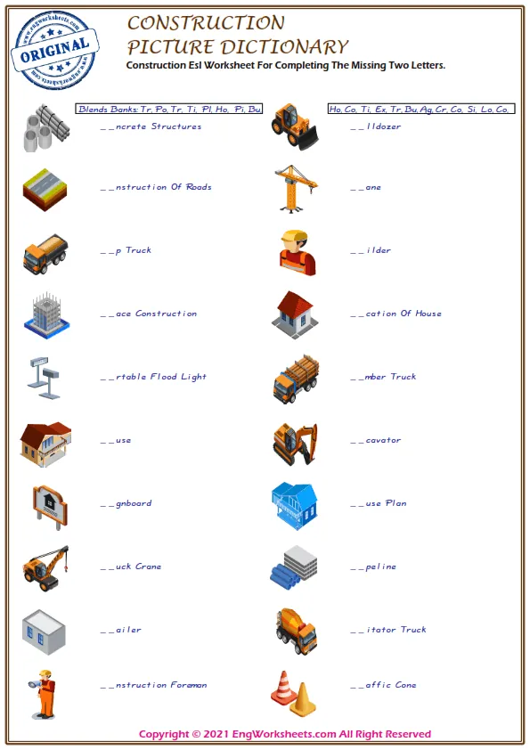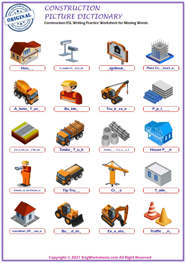 For a more challenging Construction-related exercise, our Missing English Word Completion Worksheets or Word Matching Exercise Worksheet can help. These exercises require kids to fill in the blanks or match Construction-related words, allowing them to test their knowledge in a more advanced way.