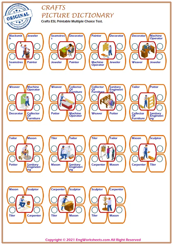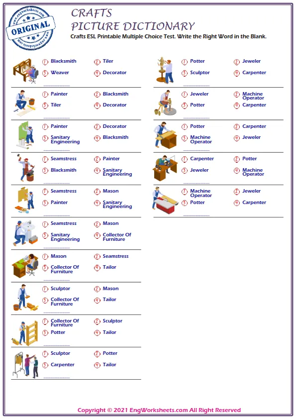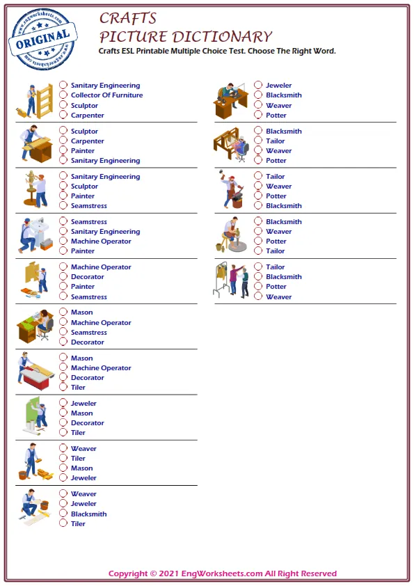 Finally, our Multiple Choice English Tests are a great way to test your Crafts-related vocabulary knowledge in a more formal setting. With a variety of questions and levels, these tests are an effective tool for assessing your progress and identifying areas for improvement.