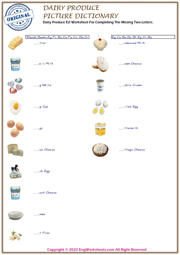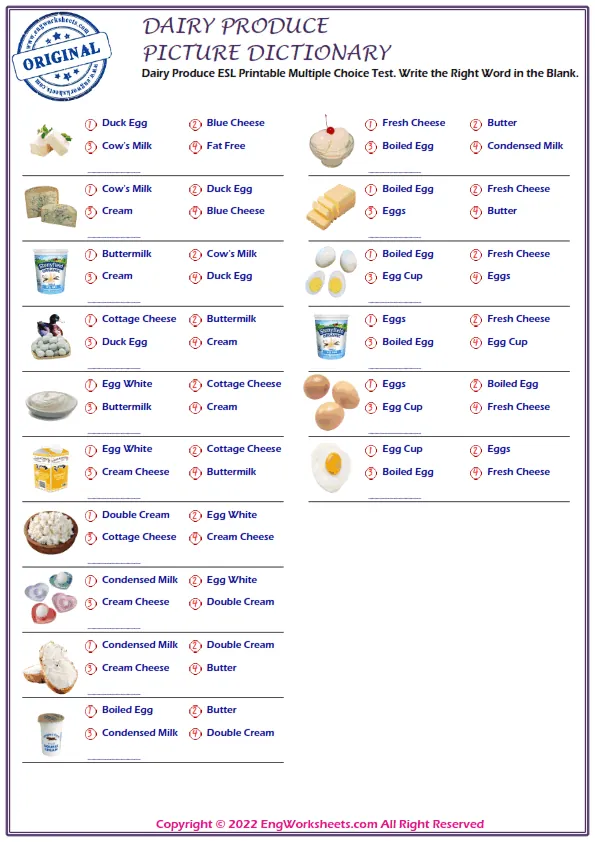 Overall, our Dairy Produce-themed ESL printable worksheets and exercises offer a fun and effective way to help your children learn and retain new vocabulary related to Dairy Produce.