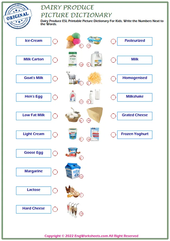Dairy Produce includes a variety of food items that are important for a healthy diet, and it is essential for kids to understand the vocabulary associated with it. At our website, we offer a range of free printable English ESL vocabulary worksheets that are perfect for improving your child's language skills related to Dairy Produce.