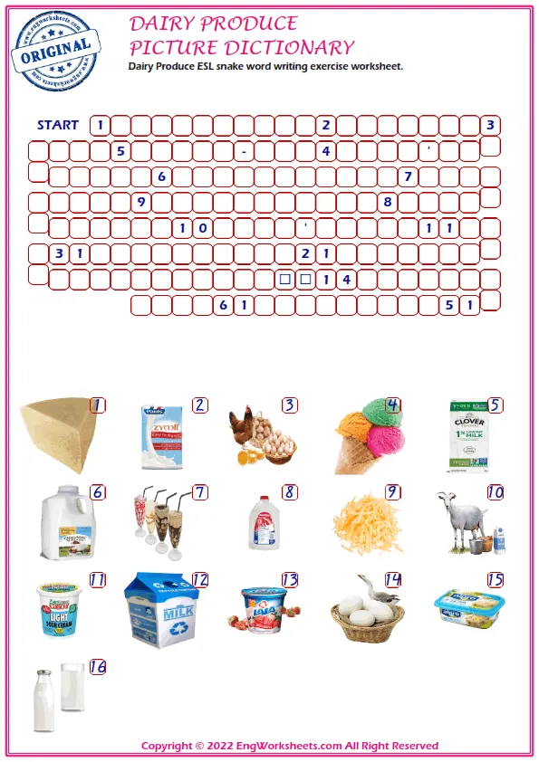 If you're looking for a more interactive Dairy Produce-themed learning experience, our Word Search Puzzle Worksheet or Word Snake Puzzle Worksheet may be just what you need. These puzzles challenge kids to find Dairy Produce-related words hidden within a grid or snake of letters, helping them to improve their vocabulary and spelling skills.