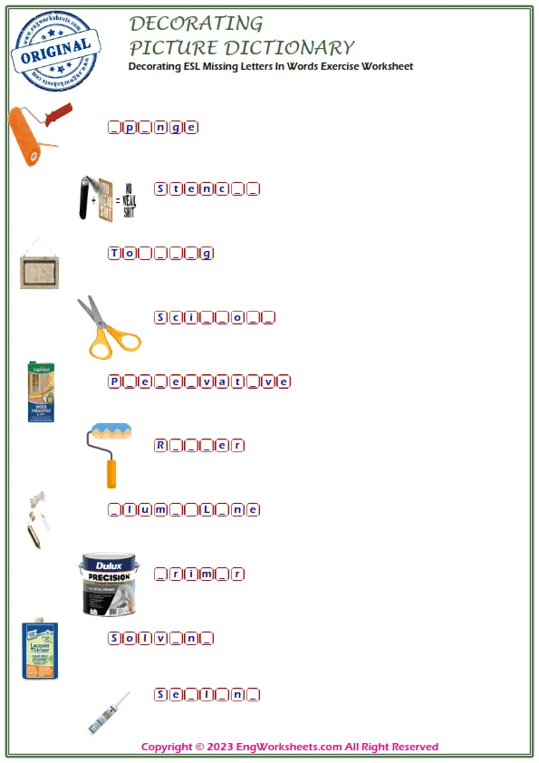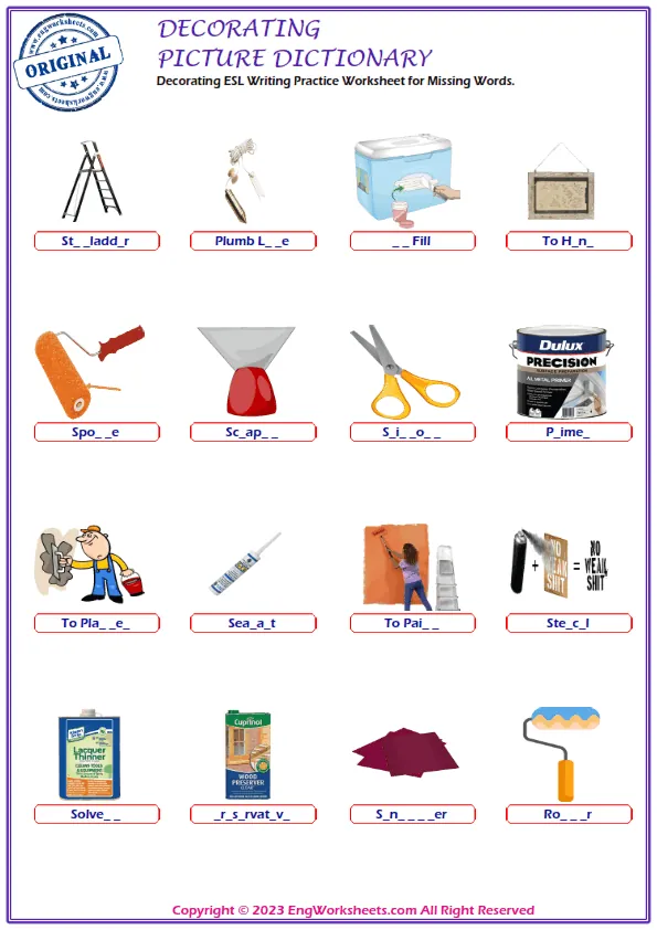 For a more challenging Decorating-related exercise, our Missing English Word Completion Worksheets or Word Matching Exercise Worksheet can help. These exercises require kids to fill in the blanks or match Decorating-related words, allowing them to test their knowledge in a more advanced way.