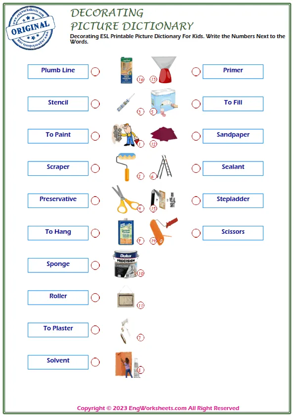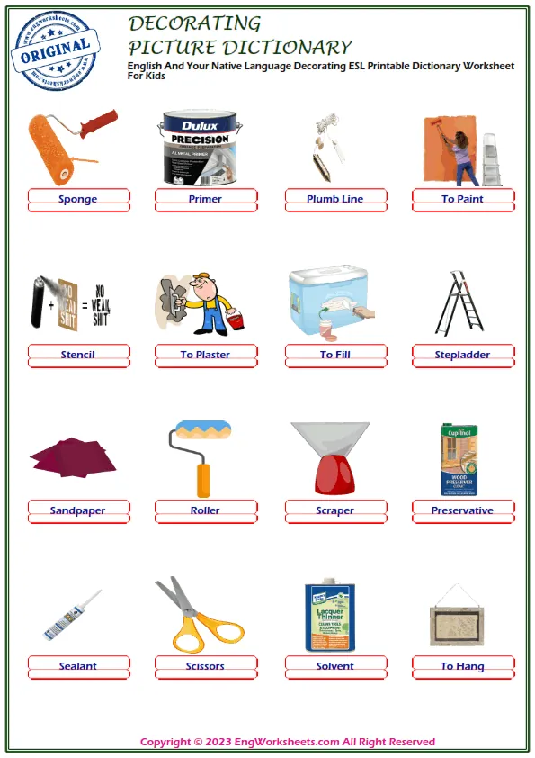 Decorating is a fun and creative activity that kids love to do, and it is important for them to understand the vocabulary associated with it. At our website, we offer a range of free printable English ESL vocabulary worksheets that are perfect for improving your child's language skills related to Decorating.