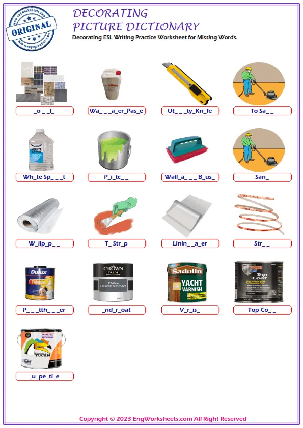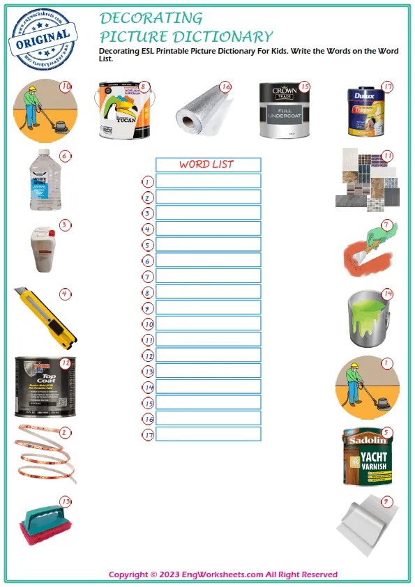 Are you looking for creative ways to help your kids improve their English vocabulary? Our Decorating-themed ESL printable worksheets and exercises are just what you need!