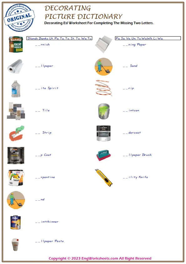 Our Missing English Word Completion Worksheets and Word Matching Exercise Worksheet are great resources for helping kids improve their grammar and vocabulary skills. These exercises challenge kids to complete sentences using the correct decorating-related words, or match words with their correct definitions.