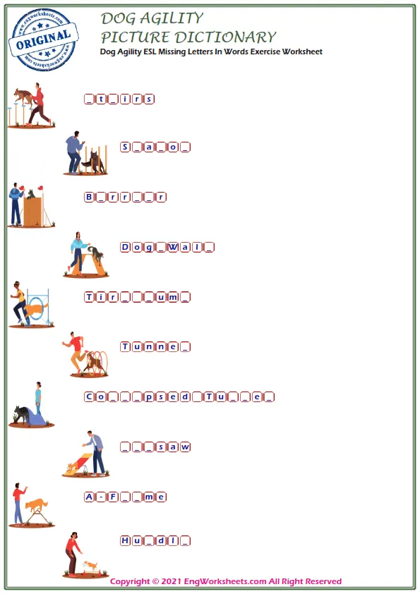For a more challenging dog agility-related exercise, our Missing English Word Completion Worksheets or Word Matching Exercise Worksheet can help. These exercises require you to fill in the blanks or match dog agility-related words, allowing you to test your knowledge in a more advanced way.