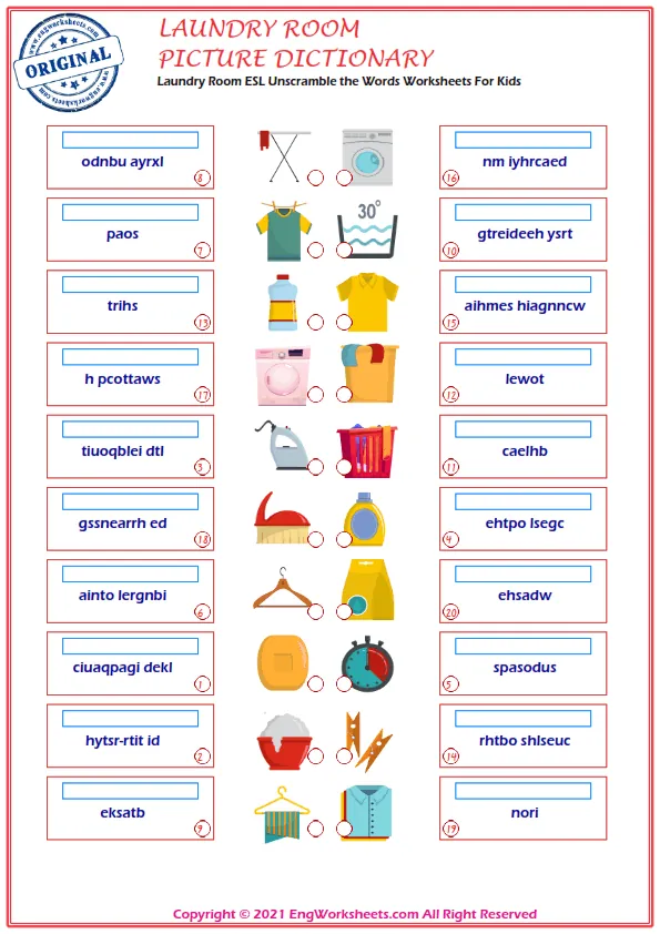 For a more challenging Laundry Room-related exercise, our Missing English Word Completion Worksheets or Word Matching Exercise Worksheet can help. These exercises require you to fill in the blanks or match Laundry Room-related words, allowing you to test your knowledge in a more advanced way.