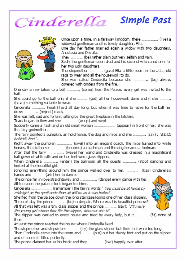 A Cinderella Fairy Tales English worksheet is an educational tool designed to teach English language skills through the classic fairy tale of Cinderella. The worksheet typically includes a variety of activities that focus on vocabulary, reading comprehension, and grammar.