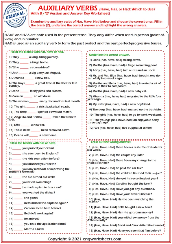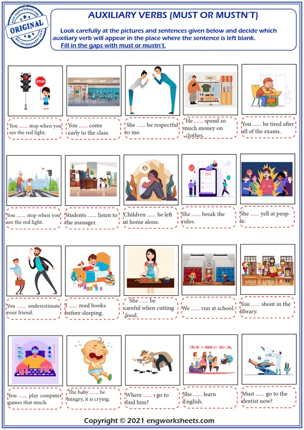 Auxiliary Verbs Grammar For Kids Esl Printable Worksheets And Examples Free Esl Printable Grammar Worksheets For Kids, Eal Exercises, Esol Quizzes, Efl Questions, Tefl Handouts, Elt Activities, English Learning And Teaching Resources, Multiple Choice Tests. Information, Rules And Examples For Kids About Auxiliary Verbs An Auxiliary Verb Helps The Main Full Verb And Is Also Called A "helping Verb." With Auxiliary Verbs, You Can Write Sentences In Different Tenses, Moods, Or Voices. Auxiliary Verbs Are: Be, Do, Have, Will, Shall, Would, Should, Can, Could, May, Might, Must, Ought, Etc. Auxiliary Verbs Are Very Important For The Correct Understanding Of A Sentence. An Auxiliary Verb That Is Not Used Correctly Affects The Meaning Of The Sentence Negatively And Can Lead To Different Meanings. A Correctly Used Auxiliary Verb Makes The Sentences Understandable By Ensuring The Correct And Proper Understanding Of The Sentence. In This Worksheet, You Will Find Useful Information And Examples Of Modal Verbs "to Be / To Have / To Do". Examine The Studies On The Auxiliary Verbs “To Be / To Have / To Do†Given Below. Take A Look At The Examples. Auxiliary Verbs Exercises, Auxiliary Verbs In English, Auxiliary Verbs Examples, Auxiliary Verbs List, Auxiliary Verbs Exercises Pdf, Auxiliary Verbs Test, Auxiliary Verbs Questions, Auxiliary Verbs Grammar, Auxiliary Verbs Worksheets, Auxiliary Verbs Grammar Worksheets.