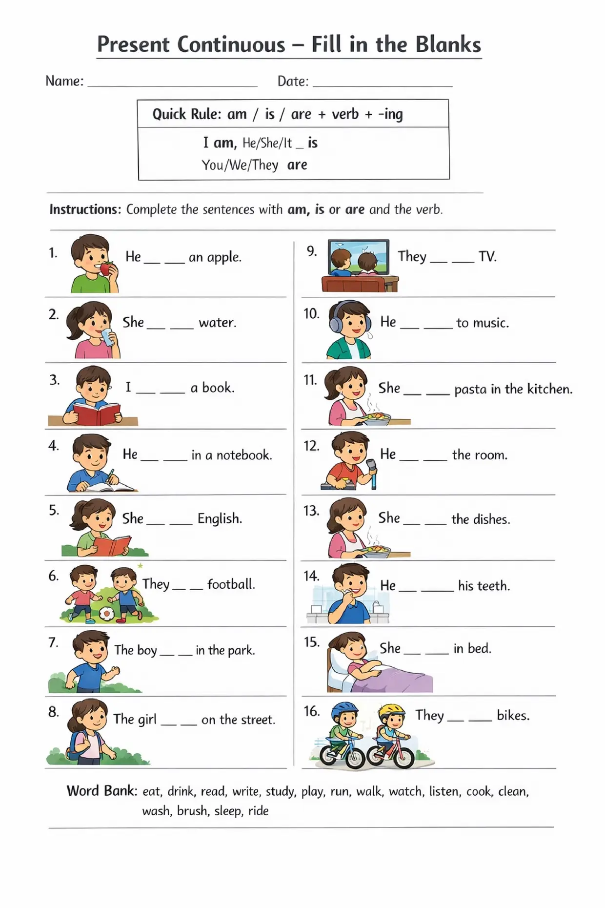 Free Printable Present Continuous Tense Worksheets (A1–A2) with Pictures