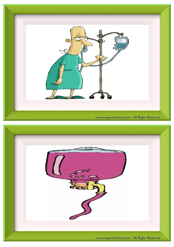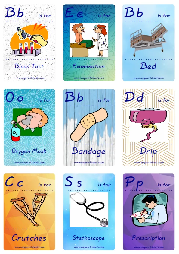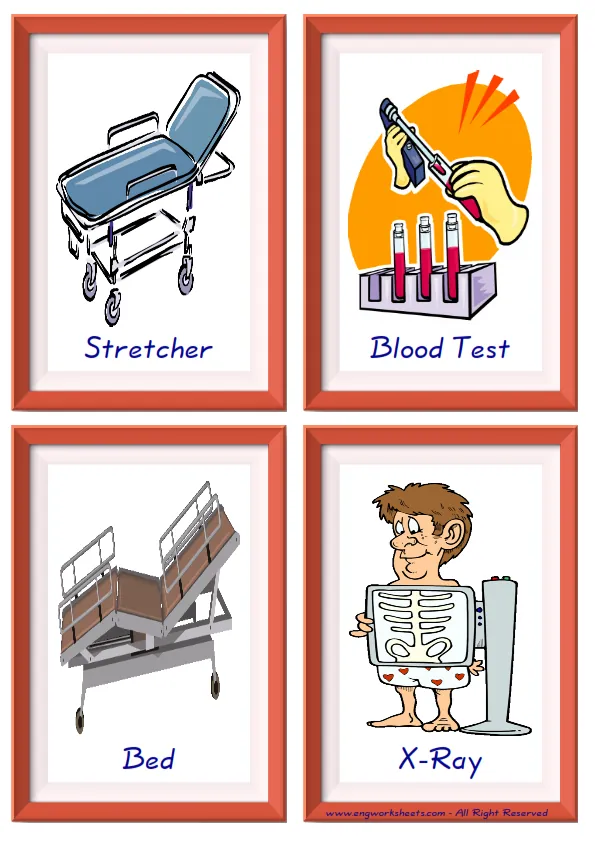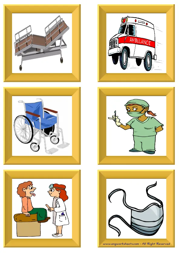 Fun Hospital Flashcards -with words- to let you constantly remember and repeat the words by using the picture you have accustomed to during the phase of learning the words. It makes learning permanent by always being in sight in your classroom or in your room. If you want, you can print them out on A4 and A3 paper; and laminate them for long-term use in your classroom or home. Six image on a page.