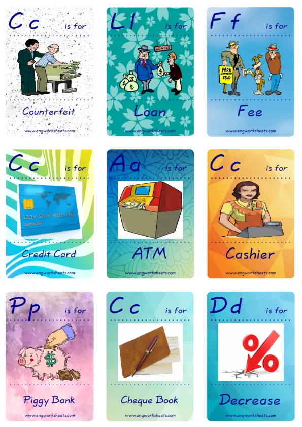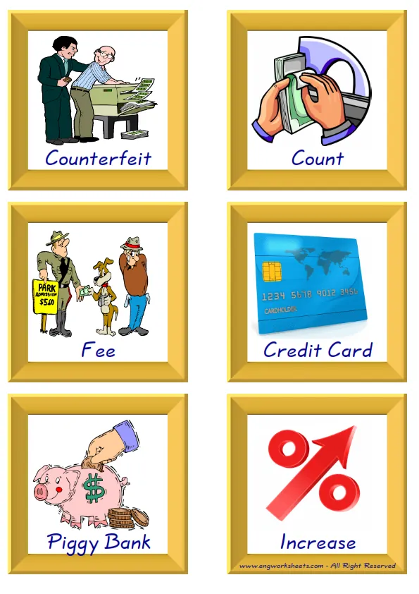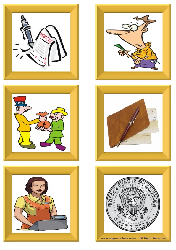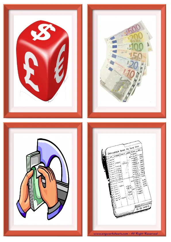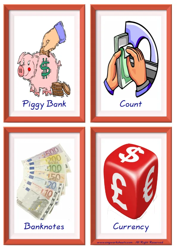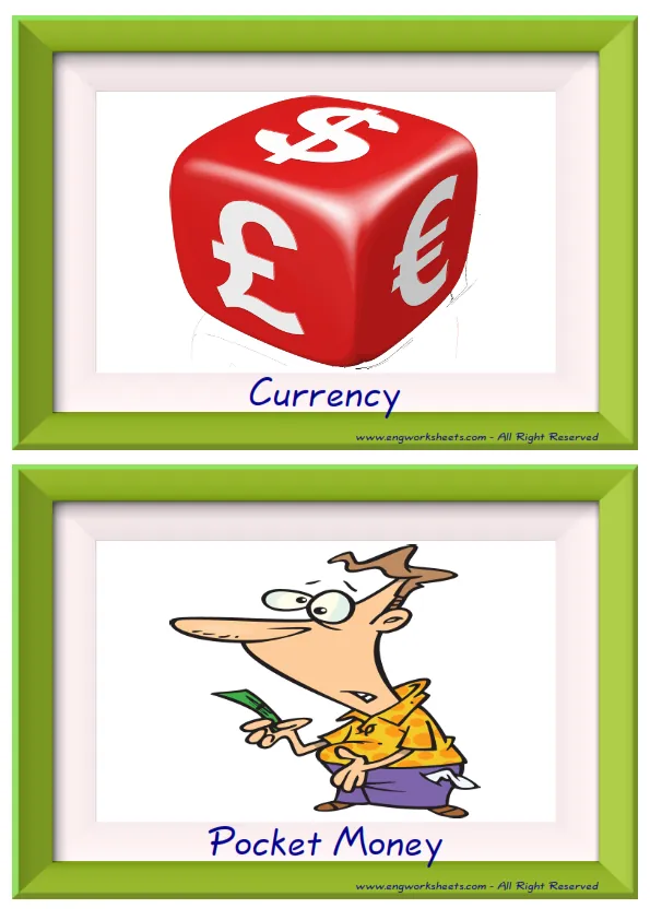 Fun half page Money Flashcards -without words- to let you constantly remember and repeat the words by using the picture you have accustomed to during the phase of learning the words. Check the picture; guess, remember and learn the word. It makes learning permanent by being in sight permanently. For long-term use in your classroom or home, you can print them out on A4 and A3 paper and laminate them if you want. Two image on a page.
