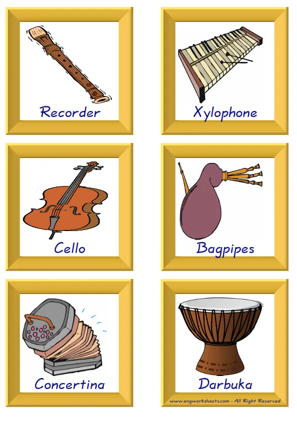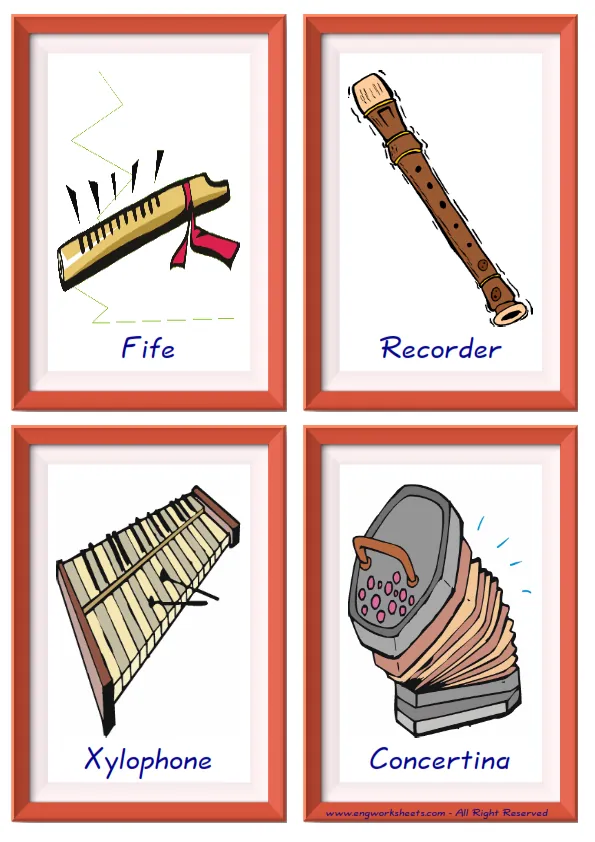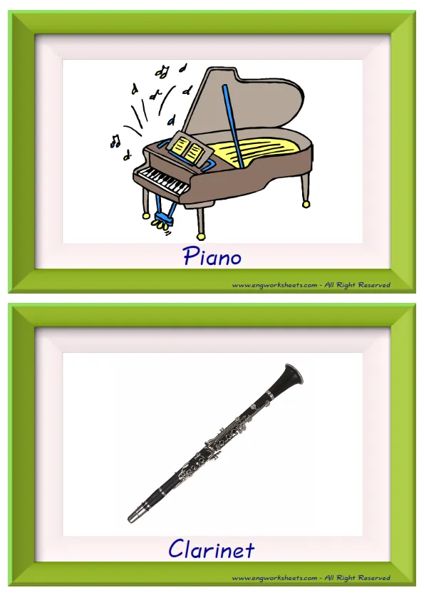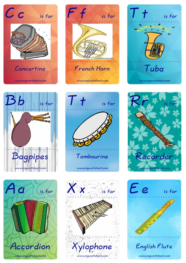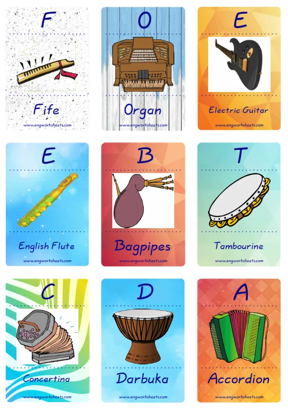 Mini size enjoyable ESL Flashcard Musical Instruments for kids and teachers.