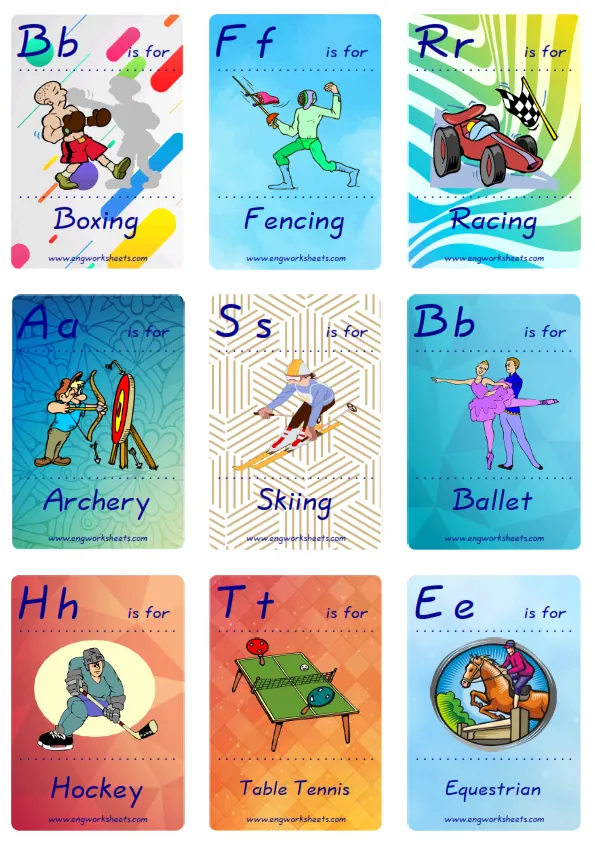 Mini size enjoyable ESL Flashcard Sports for kids and teachers.