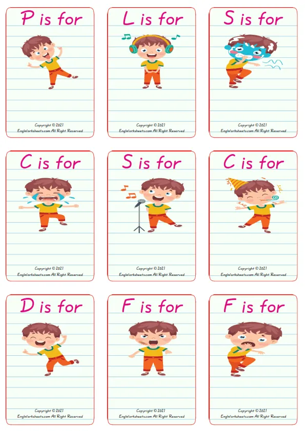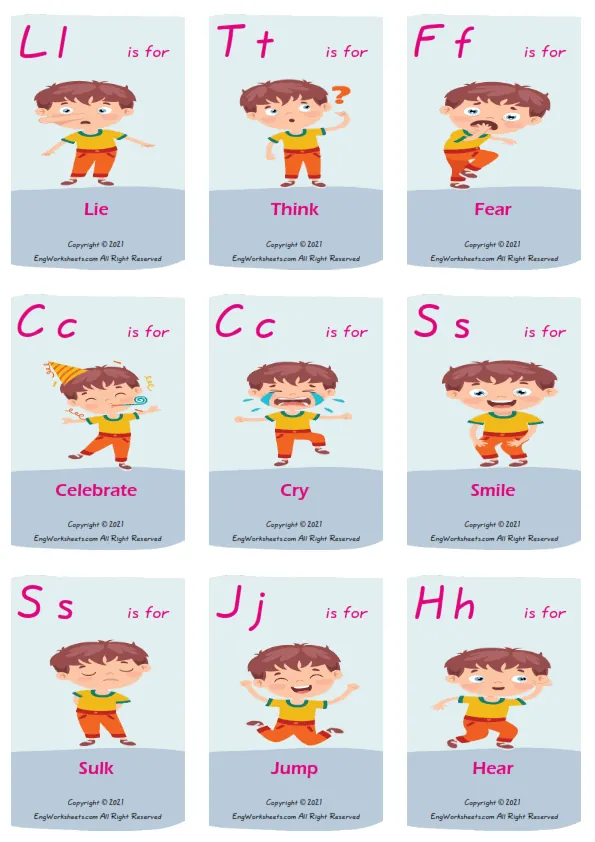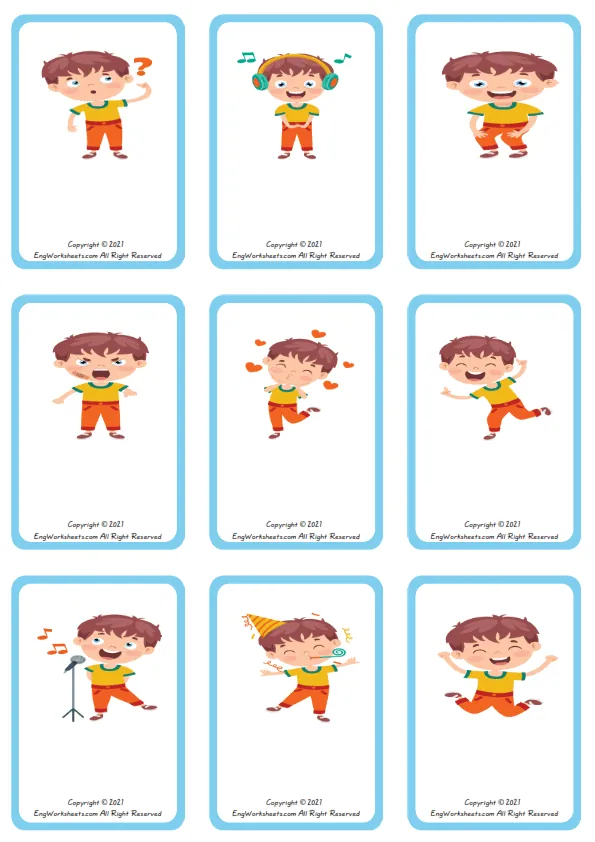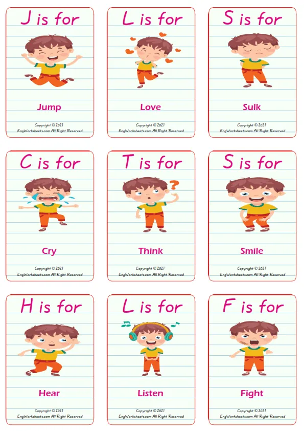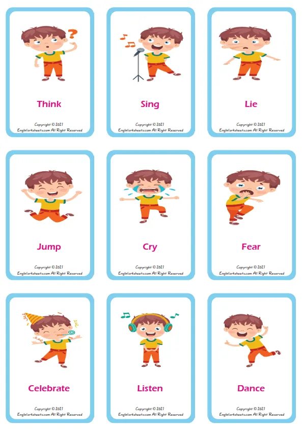 Action Verbs vocabulary worksheet with words, nine images per page