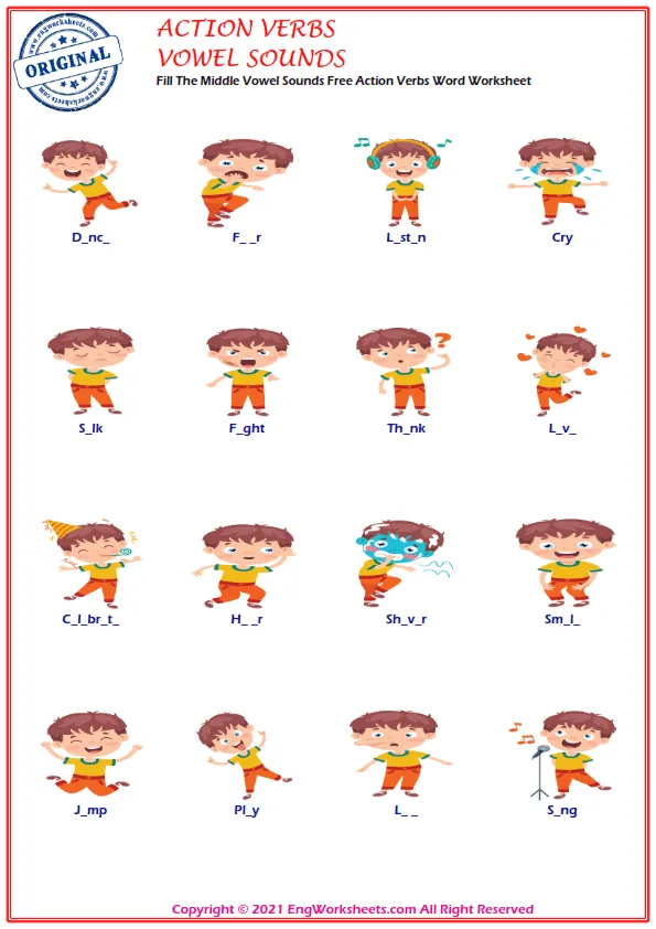 Fill The Middle Vowel Sounds Free Action Verbs Word Worksheet