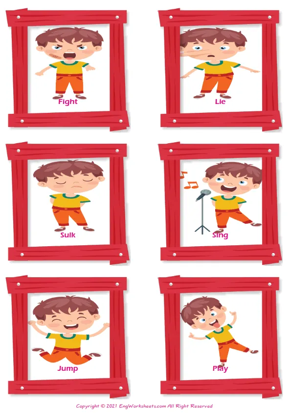 Flashcard pictures of the Action Verbs given without words, with nine pictures on a page with a different design. You can print our worksheet prepared using Action Verbs pictures in different sizes and use it for remembering in your classroom or at home. Using thick paper, you can use it with your friends to carry it in your pocket or purse at all times or to play games in the classroom. Thus, learning will become much more fun.