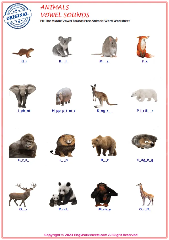 Fill The Middle Vowel Sounds Free Animals Word Worksheet
