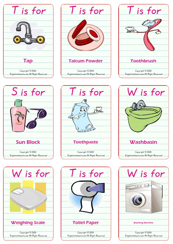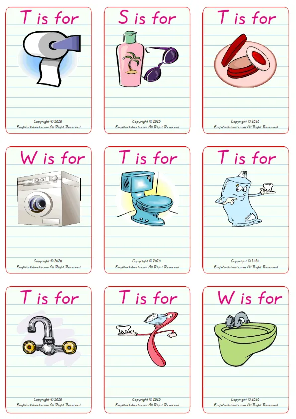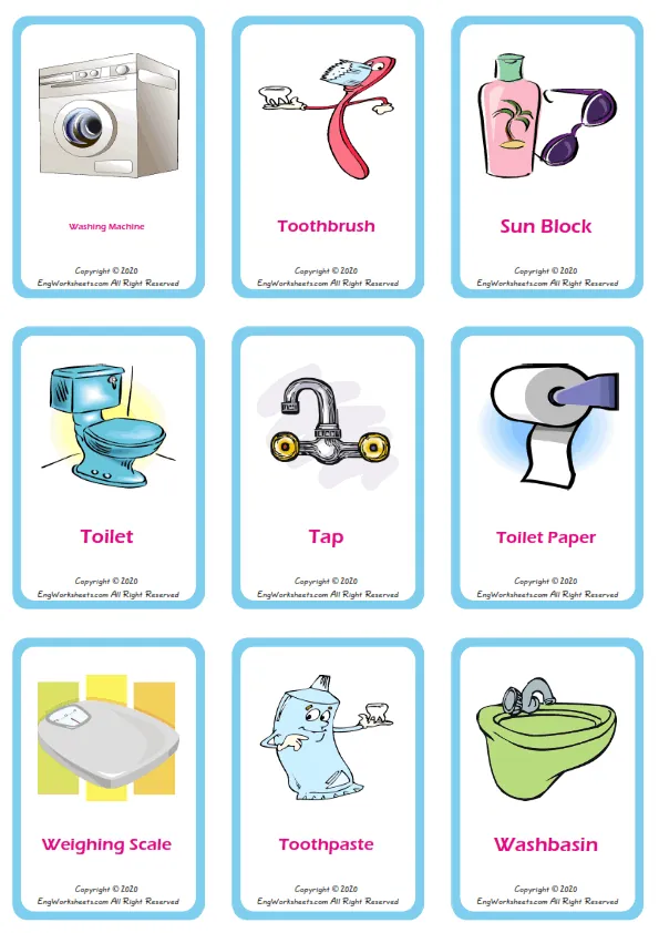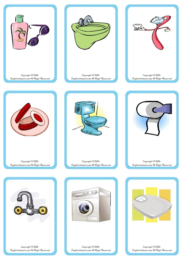 Wordless Bathroom vocabulary worksheet with nine images per page