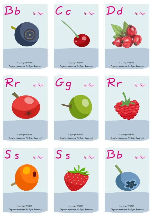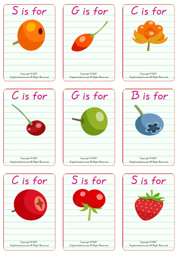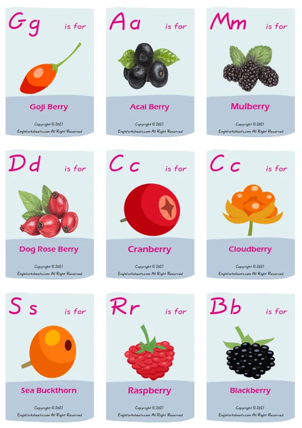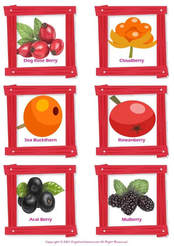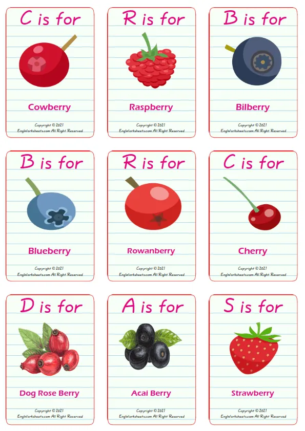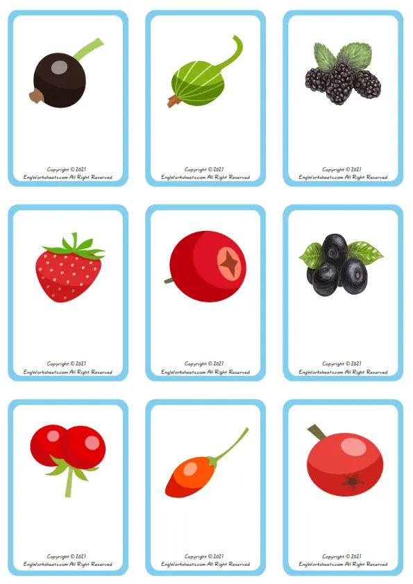 Berries Types pictures flashcard supplied with words, with nine pictures on a page with a different design. You can print our worksheet prepared using Berries Types pictures in different sizes and use it for remembering in your classroom or at home. Using thick paper, you can use it with your friends to carry it in your pocket or purse at all times or to play games in the classroom. Thus, learning will become much more fun.