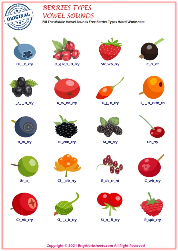 Fill The Middle Vowel Sounds Free Berries Types Word Worksheet