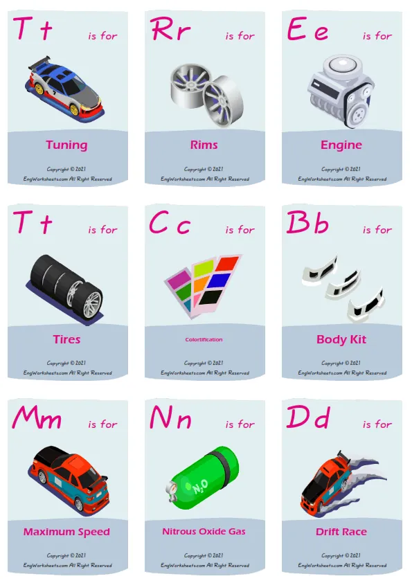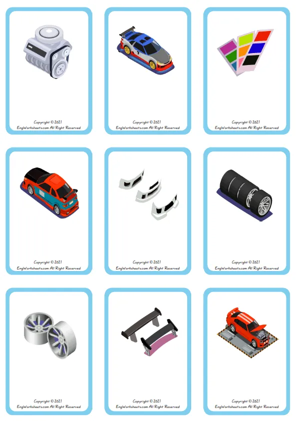 Wordless Car Tuning vocabulary worksheet with nine images per page