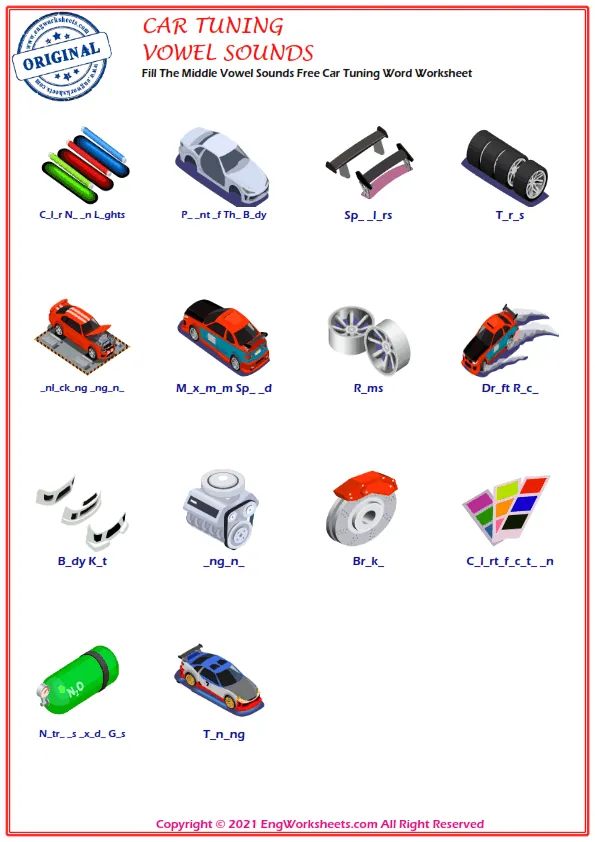 Fill The Middle Vowel Sounds Free Car Tuning Word Worksheet