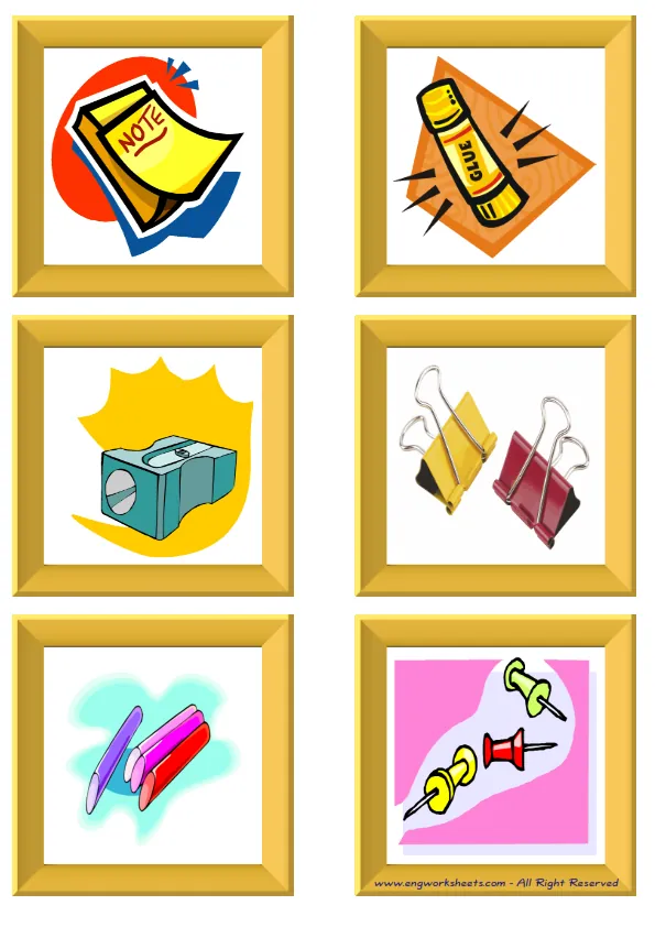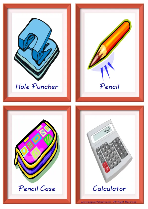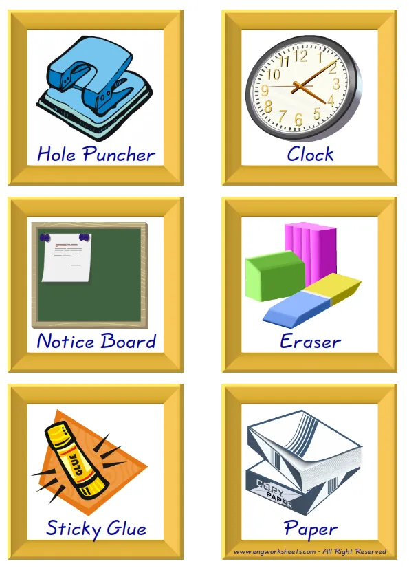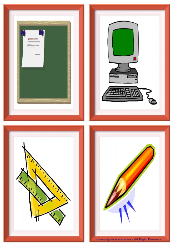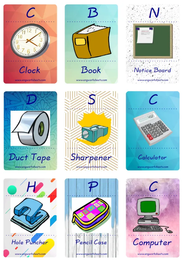 Flashcard of Classroom Objects pictures supplied with words, with nine pictures on a page. You can print our worksheet prepared using Classroom Objects pictures in different sizes and use it for remembering in your classroom or at home. Using thick paper, you can use it with your friends to carry it in your pocket or purse at all times or to play games in the classroom. Thus, learning will become much more fun.