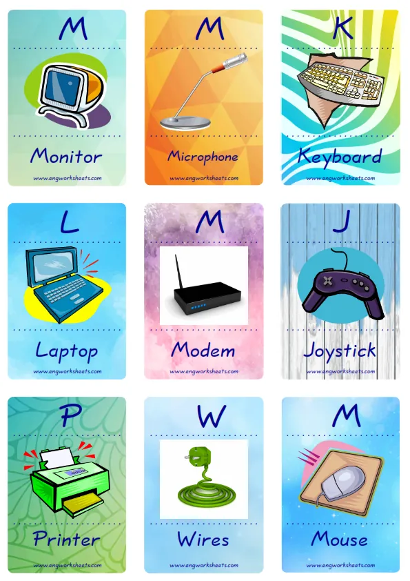 Mini size ESL Flashcard Computer Parts for kids and teachers.