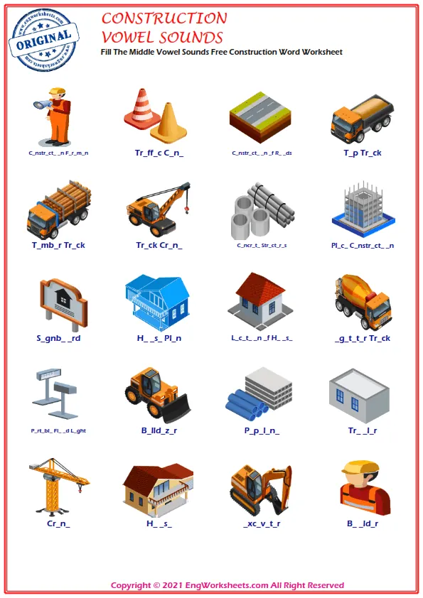 Fill The Middle Vowel Sounds Free Construction Word Worksheet