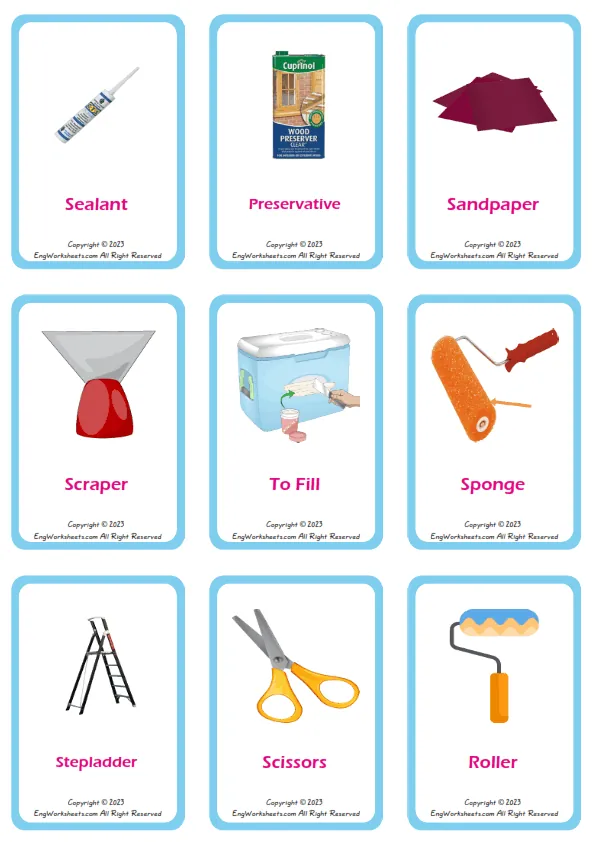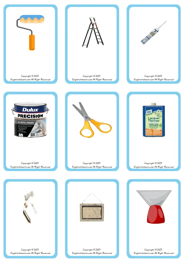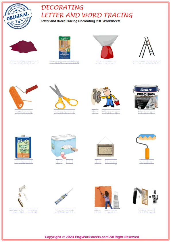 On our worksheet with a different design for kids. It allows you to check whether you learn correctly by writing the Decorating words you match with the pictures in the empty boxes. Our Decorating English worksheet is very good for vocabulary learning. Correct answers are given on the second page.
