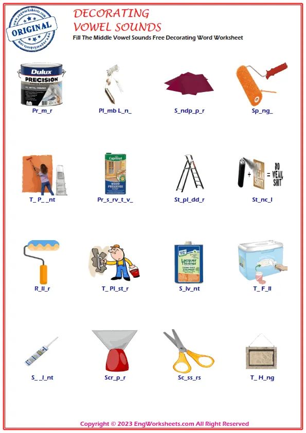 Fill The Middle Vowel Sounds Free Decorating Word Worksheet