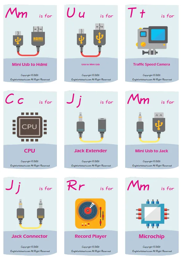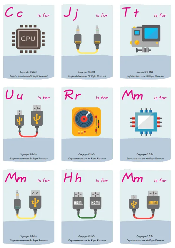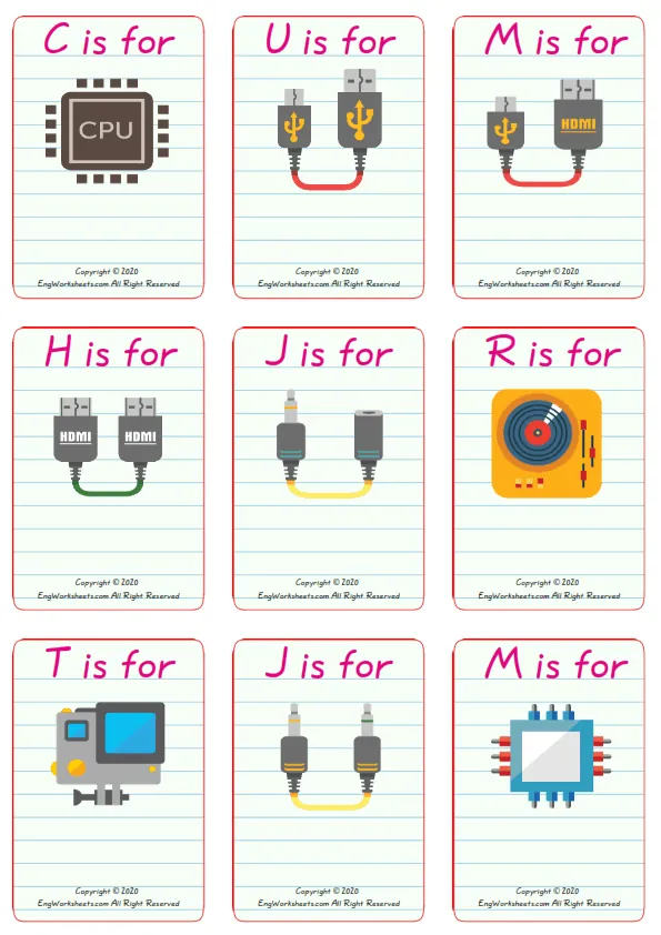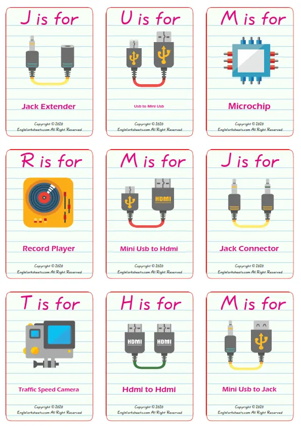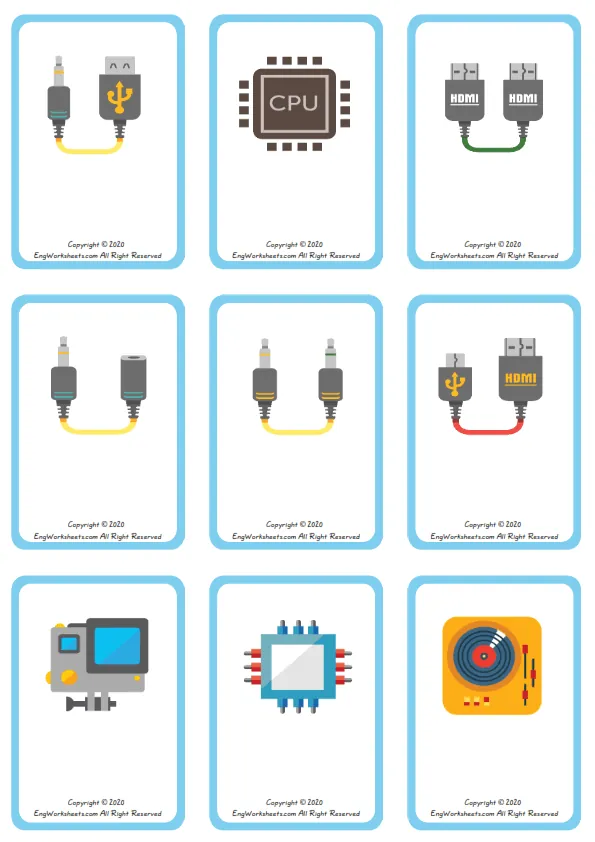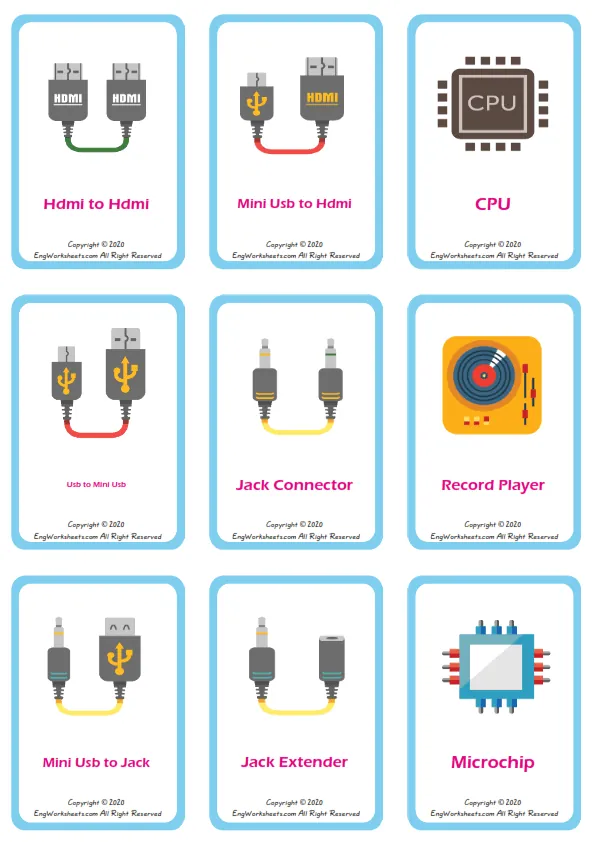 Flashcard of Devices pictures supplied with words, with four pictures on a page. You can print our worksheet prepared using Devices pictures in A5, A4, or A3 size and use it for recall in your classroom or at home.