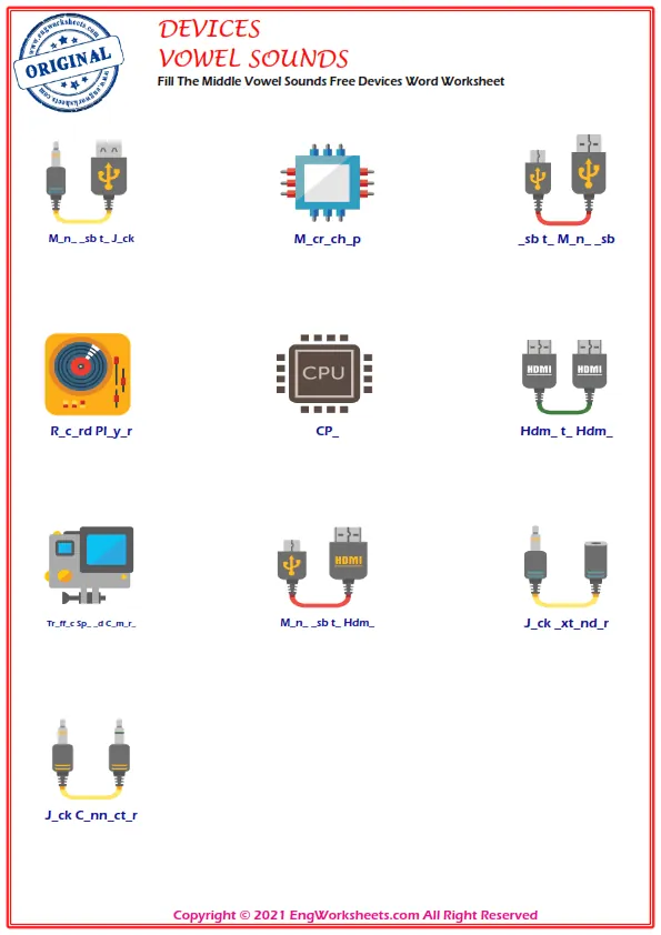 Fill The Middle Vowel Sounds Free Devices Word Worksheet