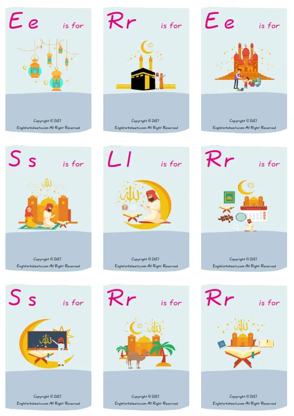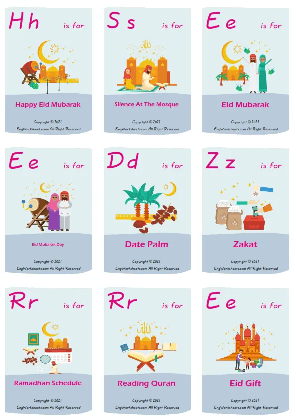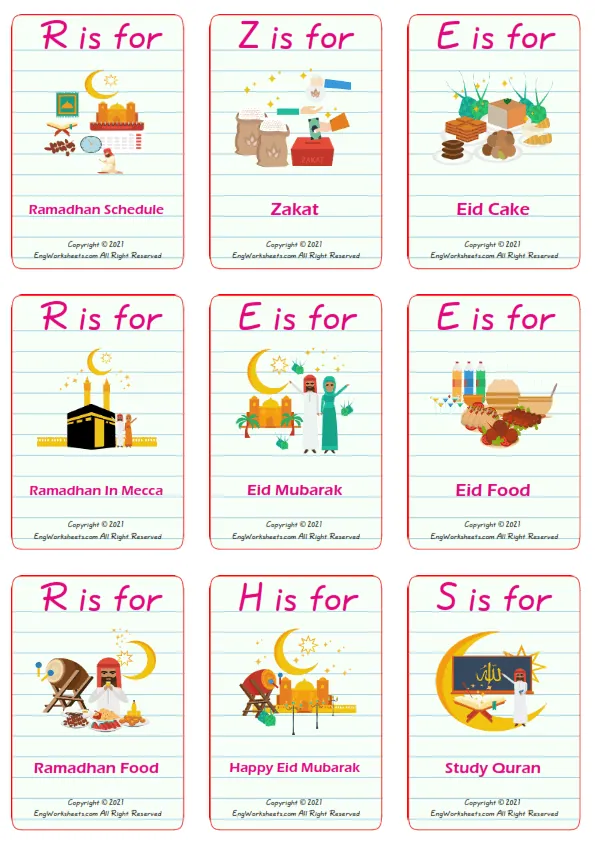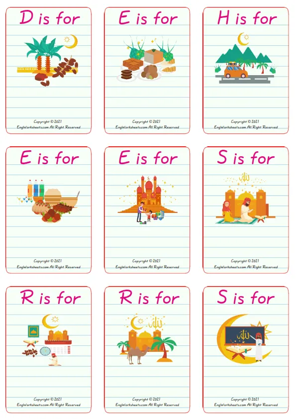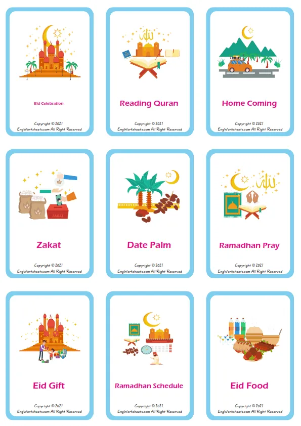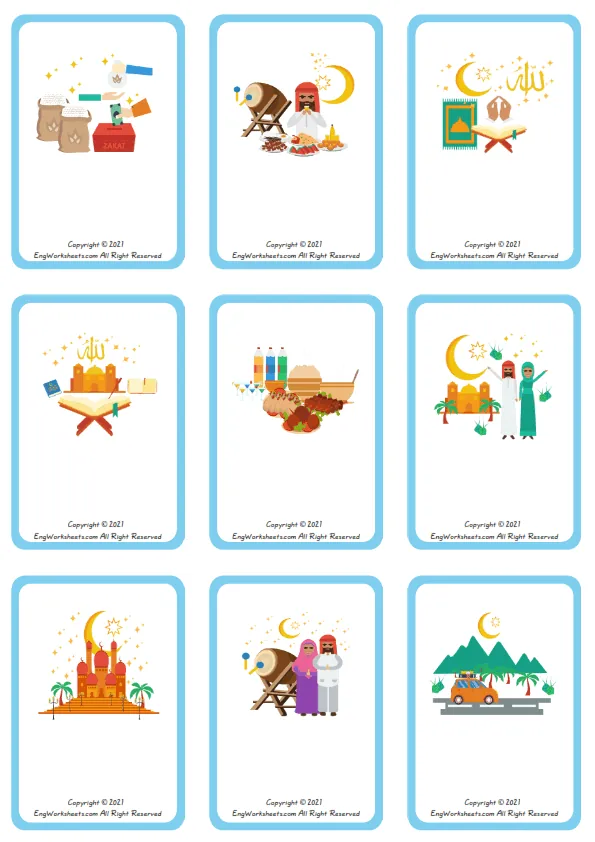 Eid and Ramadan vocabulary worksheet with words, nine images per page