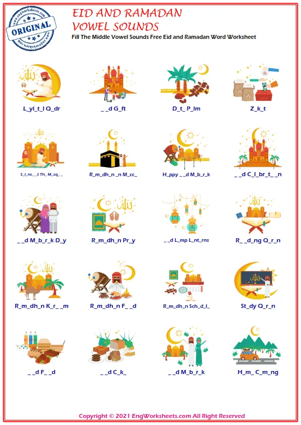 Fill The Middle Vowel Sounds Free Eid and Ramadan Word Worksheet