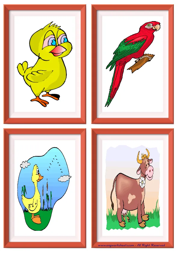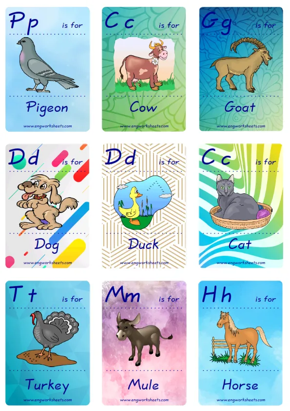 Farm Animals pictures flashcard supplied with words, with nine pictures on a page with a different design. You can print our worksheet prepared using Farm Animals pictures in different sizes and use it for remembering in your classroom or at home. Using thick paper, you can use it with your friends to carry it in your pocket or purse at all times or to play games in the classroom. Thus, learning will become much more fun.